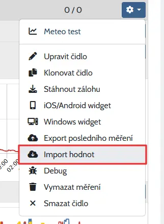 In the administration section under a specific sensor, you will find a link to import values. TMEP treats imported values retroactively by recalculating some statistics for faster display of important values—that is why retroactive import is a bit tricky and it is necessary to handle various cases that may arise. For this reason, the import was not available before, but based on demand, I have added it now. Please note that the values you import have several rules that need to be followed (in addition to the CSV file format, among other things, it is necessary to include all values for imported hours for older days, etc. within the import) - you can find out everything in the documentation here .